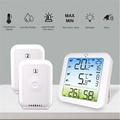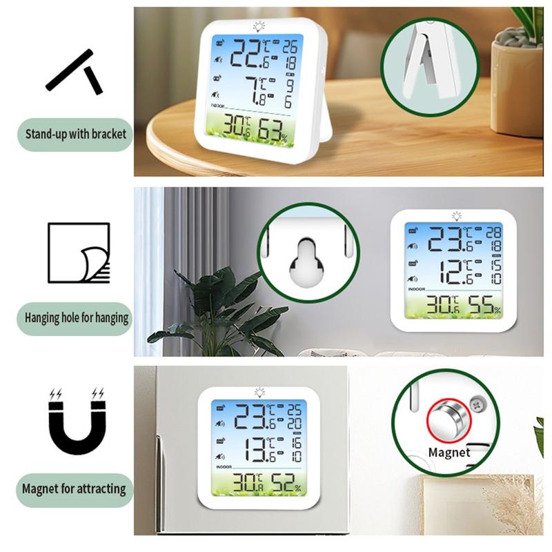 Przejrzysty wyświetlacz pokazuje dane dotyczące temperatury i wilgotności, a konfigurowalny alarm górny i dolny ostrzega, gdy odczyty wykraczają poza ustawiony zakres. Dzięki bezprzewodowej transmisji o zasięgu do 100 m w otwartych przestrzeniach, 24-godzinnej rejestracji wartości maksymalnych i minimalnych oraz elastycznym opcjom umieszczenia, jest to przydatne rozwiązanie do monitorowania w domu, w firmie i w magazynach.