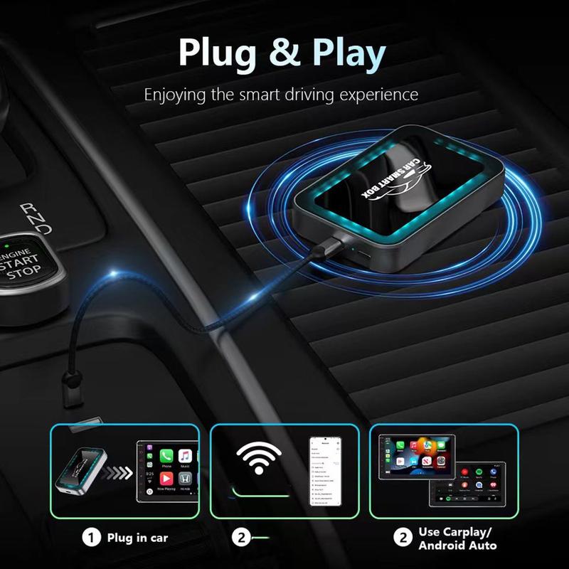 - Bezprzewodowa aktualizacja: Konwersja przewodowego CarPlay lub Android Auto na połączenie bezprzewodowe, dzięki czemu deska rozdzielcza jest wolna od kabli.