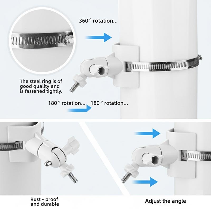 Uchwyt obsługuje obrót w poziomie o 360° i pochylenie w pionie o 180°, umożliwiając precyzyjną regulację kąta kamery w celu uzyskania maksymalnego pola widzenia. Pomaga to wyeliminować martwe punkty i zapewnia kompleksowe monitorowanie obszaru docelowego.