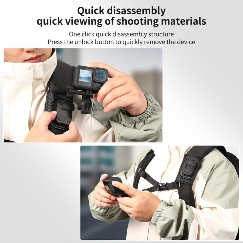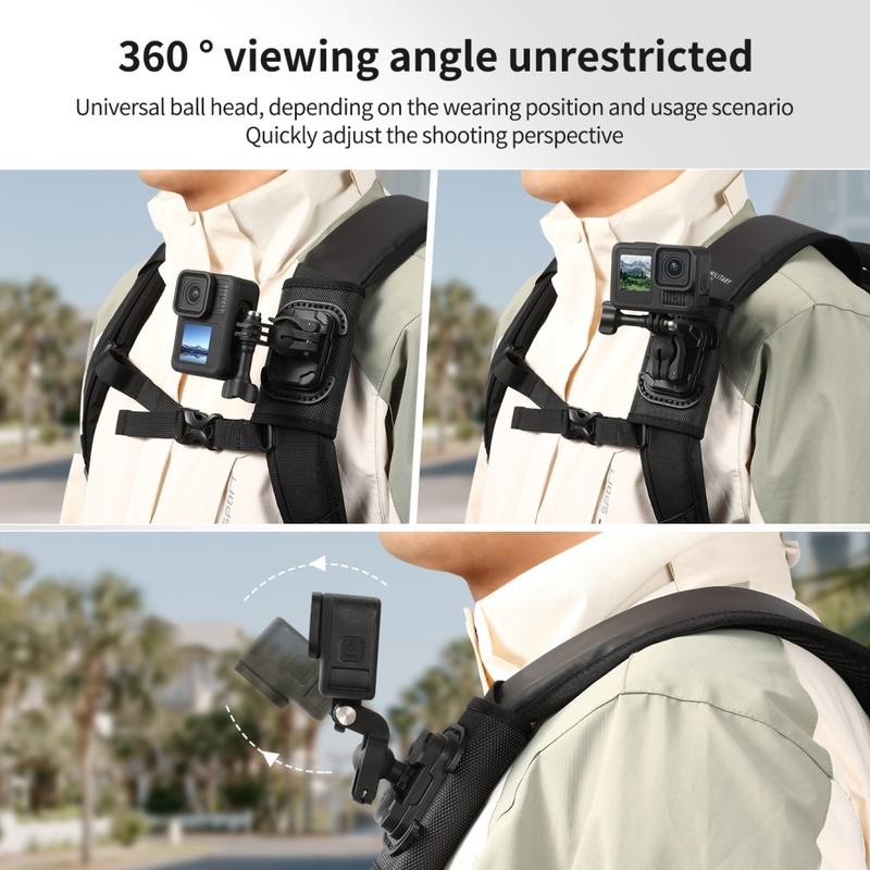 Uchwyt jest również wyposażony w uniwersalną głowicę kulową umożliwiającą elastyczną regulację kąta, co ułatwia ustawienie kamery do nagrywania z perspektywy pierwszej osoby lub ujęć z boku, w zależności od tego, jak nosisz plecak. Dzięki lekkiej konstrukcji, wytrzymałemu nylonowi i włóknom oraz funkcji szybkiego zwalniania jest to wygodne akcesorium dla twórców i użytkowników na świeżym powietrzu, którzy chcą łatwiejszego filmowania w ruchu.