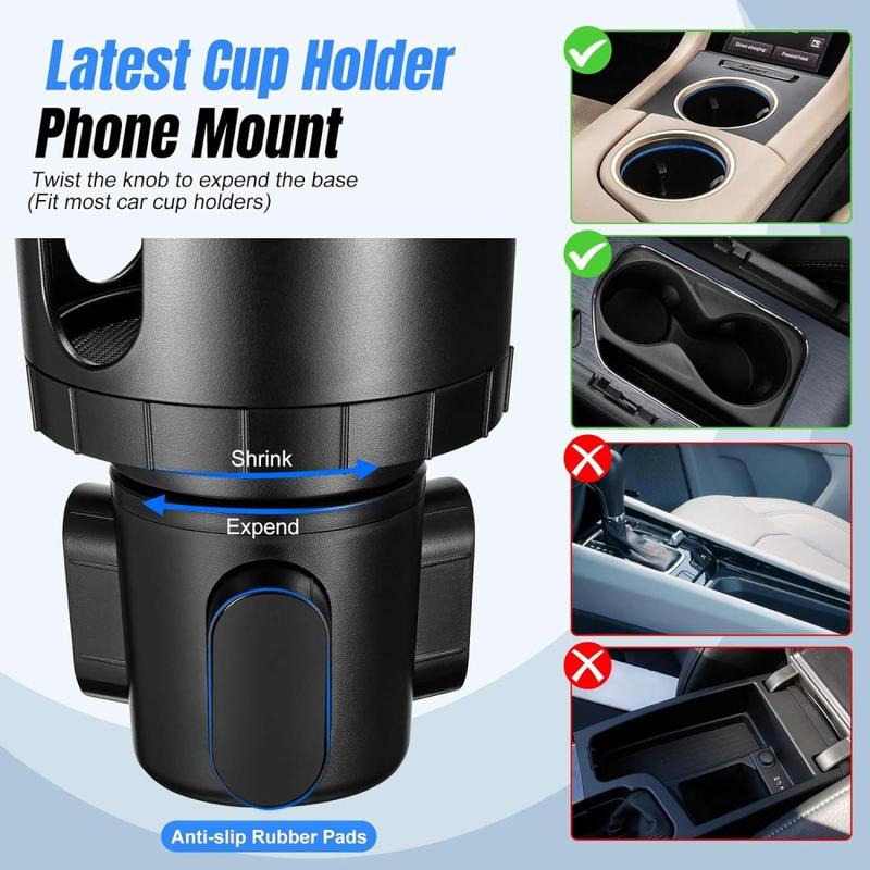 Uchwyt samochodowy 2 w 1 do montażu na uchwycie na kubek - obrotowy uchwyt z regulacją w zakresie 360° i mechanizmem szybkiego montażu, pasuje do telefonów o przekątnej ekranu od 4 do 7 cali
