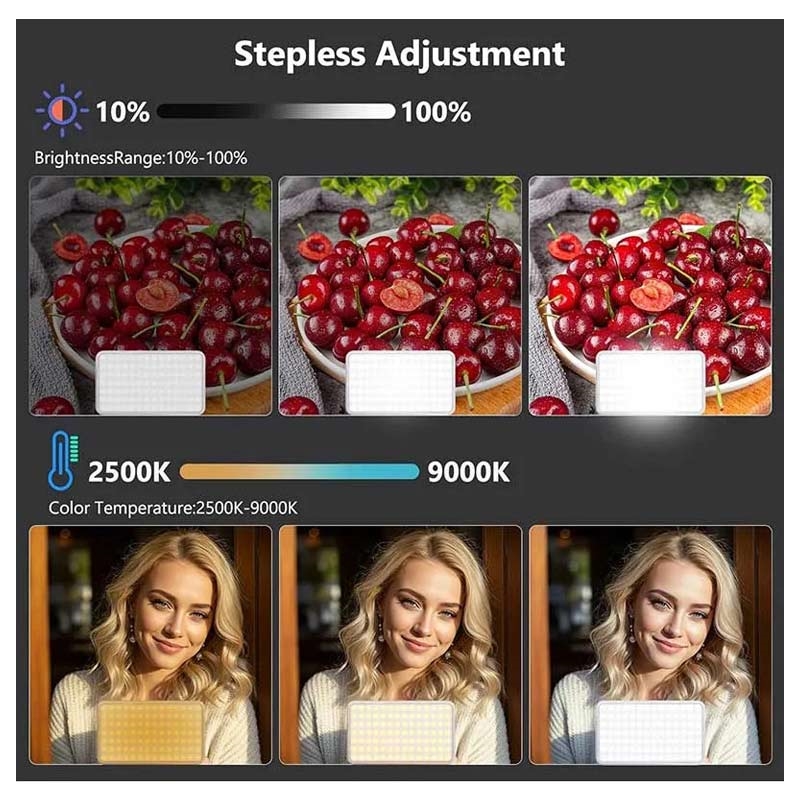 - Regulowana temperatura barwowa pomaga dopasować światło naturalne, światło wolframowe lub konfiguracje studyjne