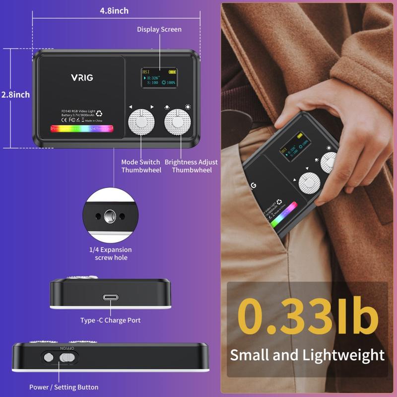 VRIG FD-98 oferuje profesjonalną jakość oświetlenia, pełną kontrolę temperatury barwowej, długą żywotność baterii i przenośność w jednym kompaktowym urządzeniu. Jest to idealne rozwiązanie dla twórców, którzy chcą niezawodnego, wysokiej jakości oświetlenia bez konieczności noszenia ciężkiego sprzętu. Połączenie CRI 95+, wyświetlacza OLED i bezstopniowego sterowania zapewnia kreatywną elastyczność, zwykle spotykaną w znacznie większych lampach.