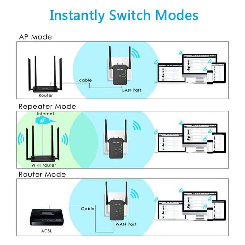Urządzenie obsługuje tryb routera, tryb repeatera i tryb punktu dostępowego (AP), umożliwiając dostosowanie do różnych wymagań sieciowych. W trybie AP może przekształcić przewodowe połączenie LAN w sieć bezprzewodową dla laptopów, tabletów i smartfonów.