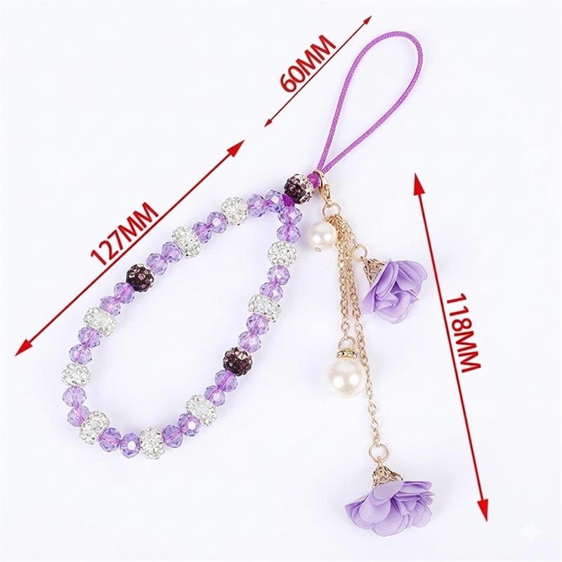 Dodaj elegancki akcent do swojego telefonu dzięki tej smyczy o długości 18,7 cm z kryształowymi koralikami. Zaprojektowana zarówno jako ozdobny dodatek, jak i praktyczny pasek na nadgarstek, łączy w sobie koraliki w stylu kryształów, metalowe akcenty imitujące cyrkonie, zawieszki w kształcie róż oraz wisior z imitacji perły, tworząc wyrafinowaną stylizację na co dzień.