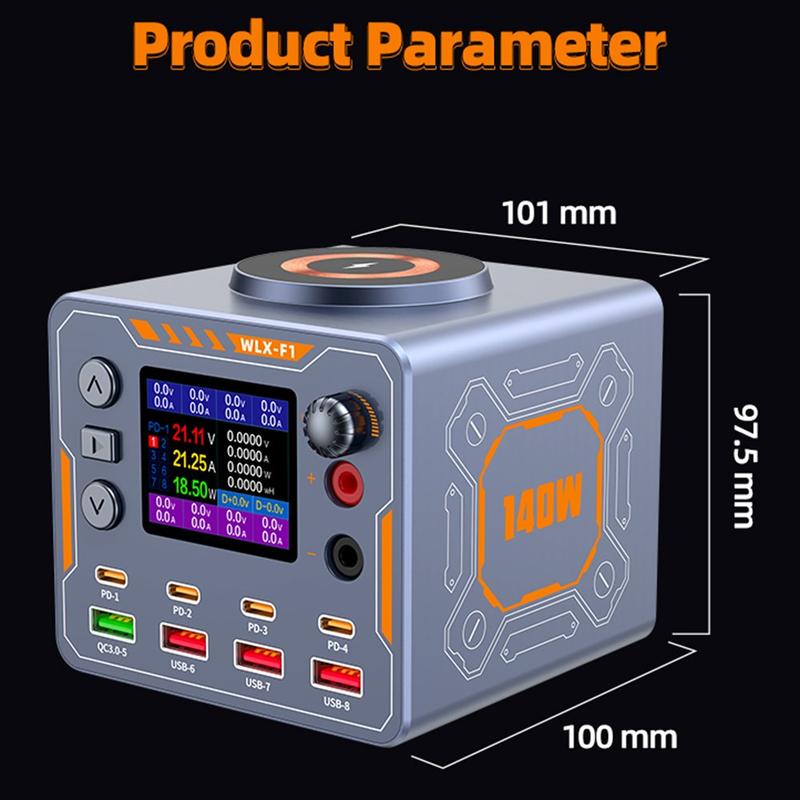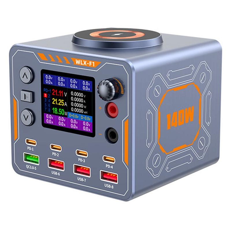 Niesamowita stacja ładująca WLX-F1 140W do wielu urządzeń to potężna i wszechstronna ładowarka biurkowa przeznaczona do laptopów, telefonów, tabletów, urządzeń do noszenia, a nawet naprawy elektroniki. Wyposażona w 8 opcji ładowania, w tym cztery porty szybkiego ładowania PD, jeden port QC3.0, trzy porty USB i bezprzewodową podkładkę ładującą 15 W, zapewnia kompletne rozwiązanie do ładowania w domu, biurze lub warsztacie.
