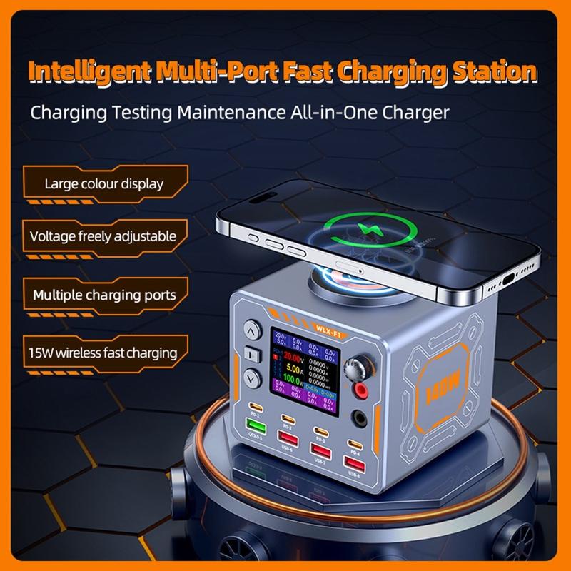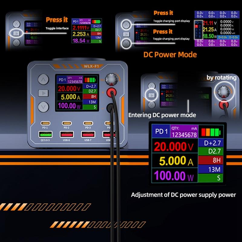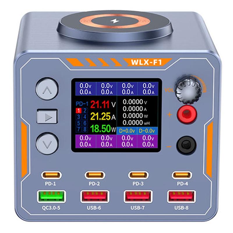 Dzięki mocy wyjściowej do 100 W na pojedynczym porcie, WLX-F1 skutecznie zasila urządzenia o dużym zapotrzebowaniu, takie jak MacBooki i laptopy USB-C. Posiada również regulowane precyzyjne wyjście DC (1,8-12 V, 2 A), dzięki czemu idealnie nadaje się do testowania, naprawy i diagnozowania sprzętu elektronicznego.