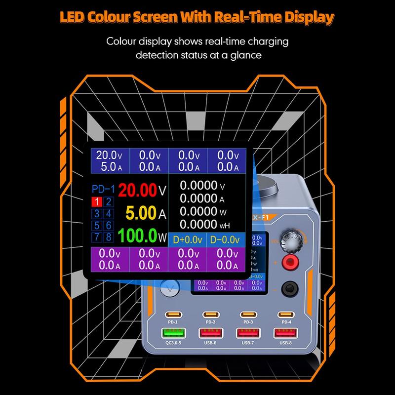 Kolorowy wyświetlacz HD zapewnia monitorowanie napięcia i prądu w czasie rzeczywistym z dokładnością 0,001 V / 0,001 A, zapewniając bezpieczne, dokładne i kontrolowane ładowanie. Wbudowany inteligentny chip automatycznie identyfikuje podłączone urządzenia i dostosowuje dostarczaną moc w celu uzyskania optymalnej wydajności ładowania.