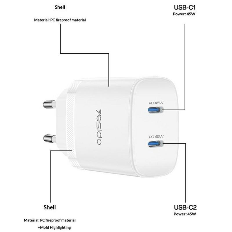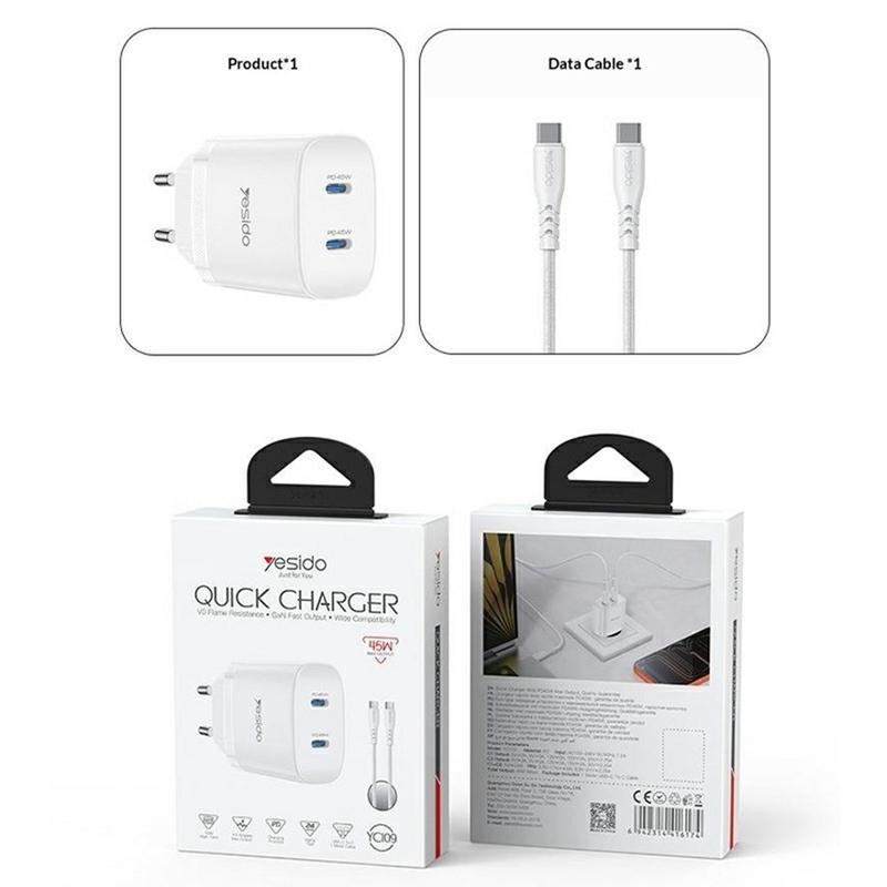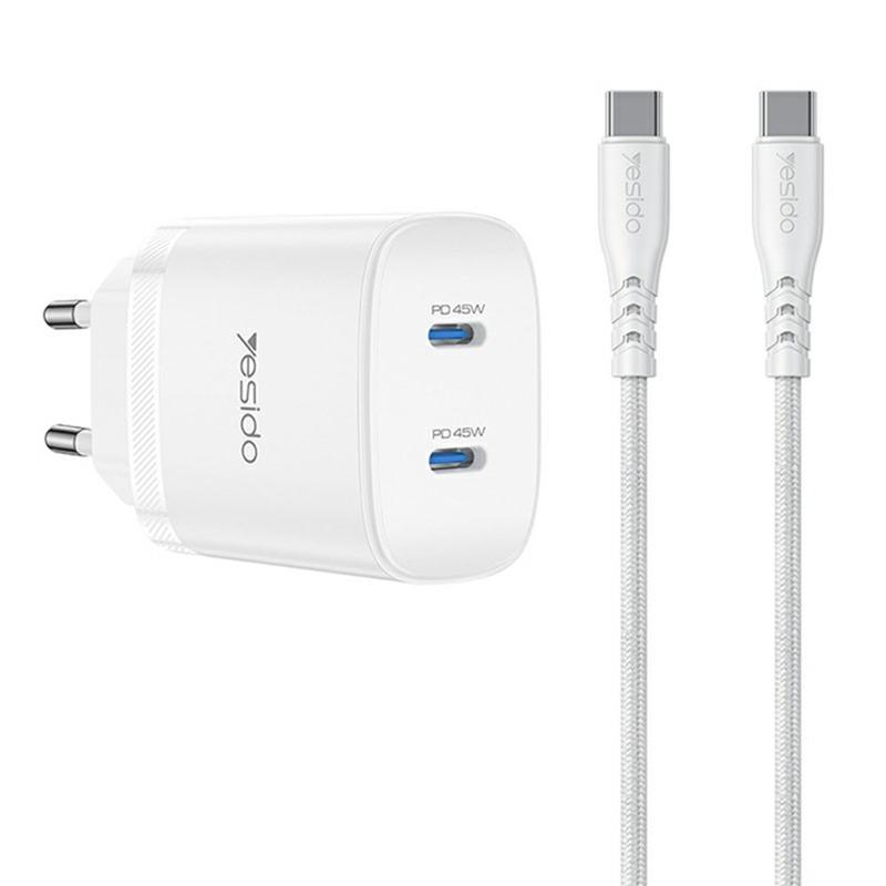 Yesido YC109 45W podwójna ładowarka USB-C PD z kablem USB-C - szybka ładowarka ścienna