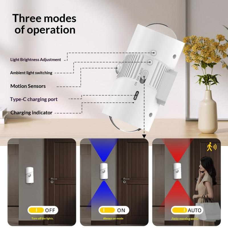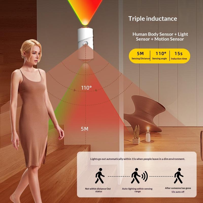 Jego inteligentny system wykrywania reaguje na ruch w warunkach słabego oświetlenia, włączając się automatycznie i wyłączając po krótkim opóźnieniu, co pomaga oszczędzać energię. Dzięki 4 poziomom jasności i wielu trybom oświetlenia może służyć zarówno jako praktyczna lampka nocna, jak i przytulne oświetlenie nastrojowe. Magnetyczna konstrukcja ułatwia montaż, bez konieczności wiercenia lub skomplikowanej instalacji.