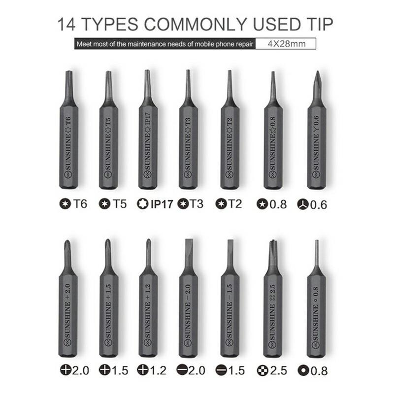 Zestaw elektrycznego wkrętaka precyzyjnego SUNSHINE SD-18E - akumulatorowe narzędzie naprawcze z aluminium z 14 stalowymi końcówkami i 3 diodami LED