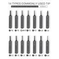 - W zestawie znajduje się 14 magnetycznych końcówek ze stali stopowej S2 do typowych zadań naprawczych