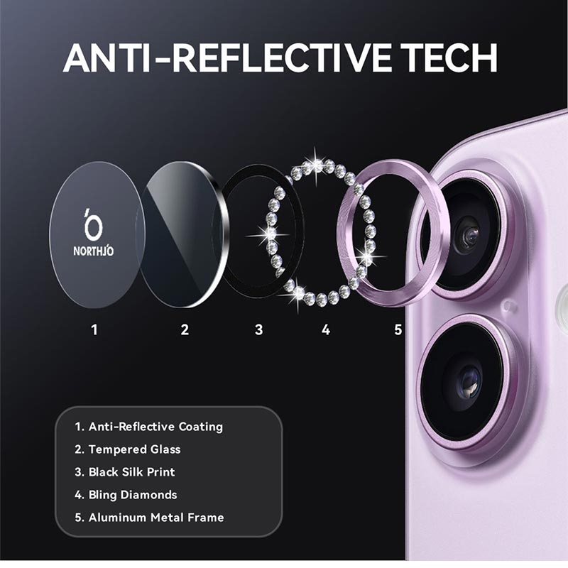 NORTHJO Rhinestone Lens Protector oferuje to, co najlepsze z obu światów - najwyższej jakości blask i wysoką wytrzymałość. Poprawia wygląd telefonu, zachowując profesjonalną przejrzystość zdjęć i codzienną ochronę.