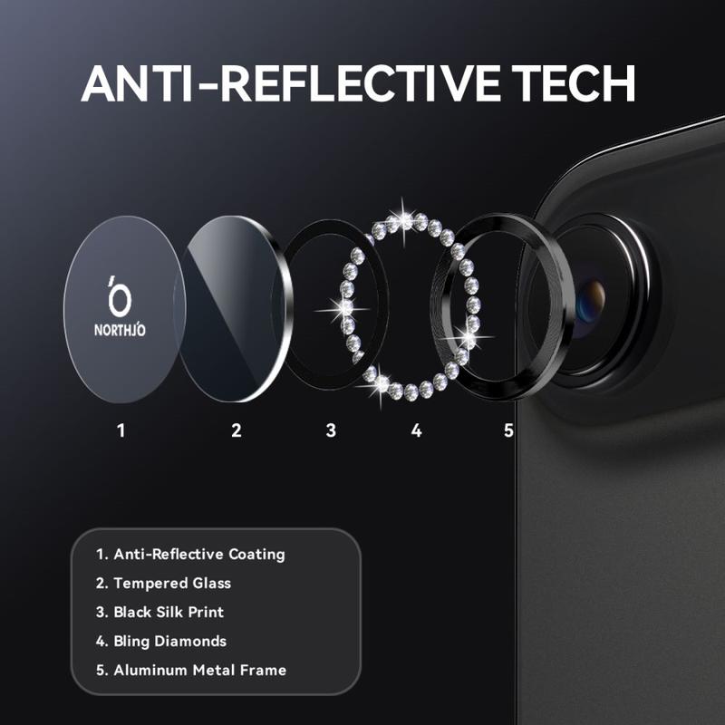 NORTHJO Rhinestone Lens Protector oferuje to, co najlepsze z obu światów - najwyższej jakości blask i wysoką wytrzymałość. Poprawia wygląd telefonu, zachowując profesjonalną przejrzystość zdjęć i codzienną ochronę.