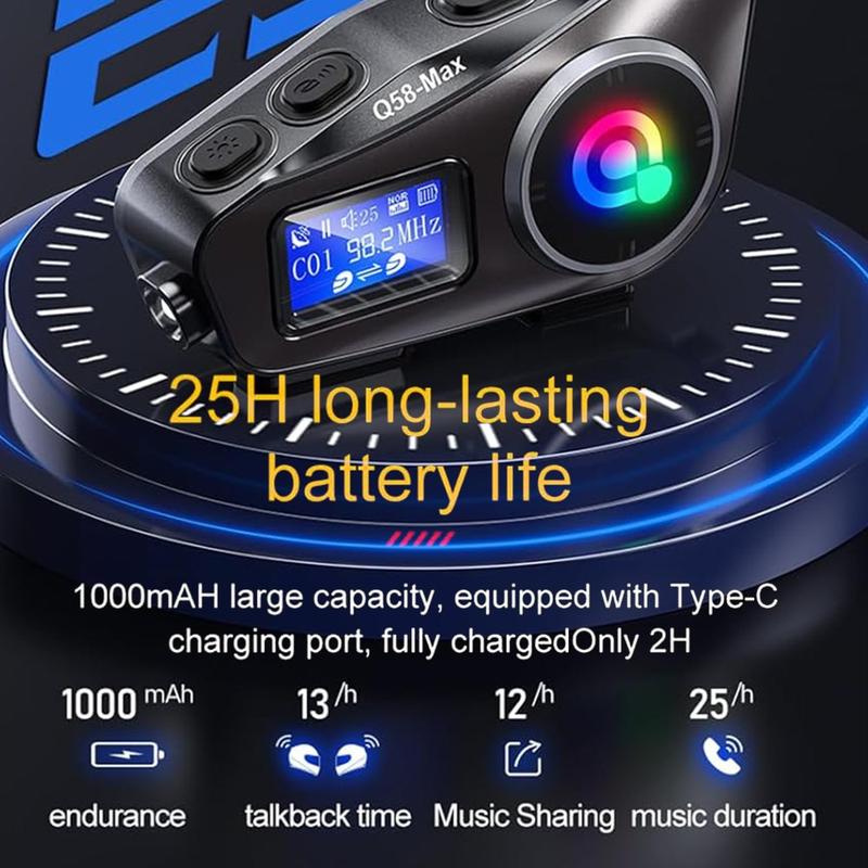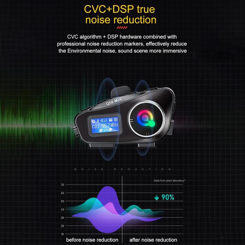 Q58Max wykorzystuje dwurdzeniowe układy Bluetooth 5.3 i obsługuje komunikację interkomową między dwoma motocyklistami na odległość do 500m w określonych warunkach. Obsługuje również priorytetowe traktowanie połączeń podczas korzystania z interkomu, co pozwala nadać pierwszeństwo połączeniom przychodzącym w razie potrzeby. Dzięki głośnikom o średnicy 40 mm i 6 efektom dźwiękowym EQ zestaw słuchawkowy został zaprojektowany tak, aby zapewnić wyraźniejszy dźwięk podczas rozmów, komunikatów nawigacyjnych, odtwarzania muzyki i komunikacji interkomowej w typowych warunkach jazdy.